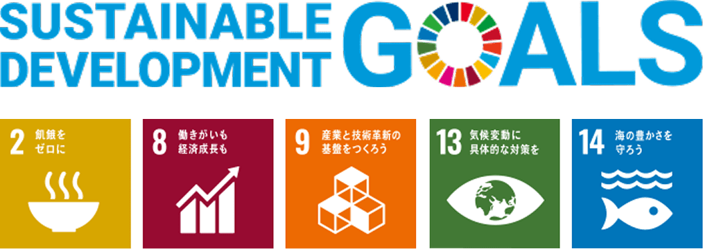 本取り組みは、SDGs目標の2番、8番、9番、13番、14番に貢献するものと考えています。