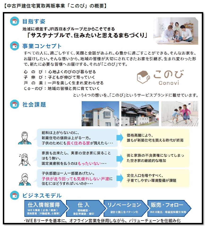 JR西日本イノベーションズは、中古戸建住宅を直接買取りリフォーム・リノベーションし、再生住宅としてリーズナブルな価格で提供するサービス「このび」を開始致します。住宅価格の高騰で、住宅購入のハードルが高まっていることに加え、全国で空き家の増加が深刻な社会問題となる中、空き家等を「持続可能なまちの資産(地域キャピタル)」に変えることで、地域活性化と サステナブルな まちづくりへの貢献を目指します。