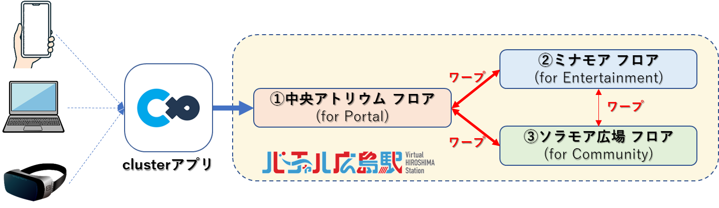 ・バーチャル広島駅は、メタバースプラットフォーム「cluster」にて展開されます。
