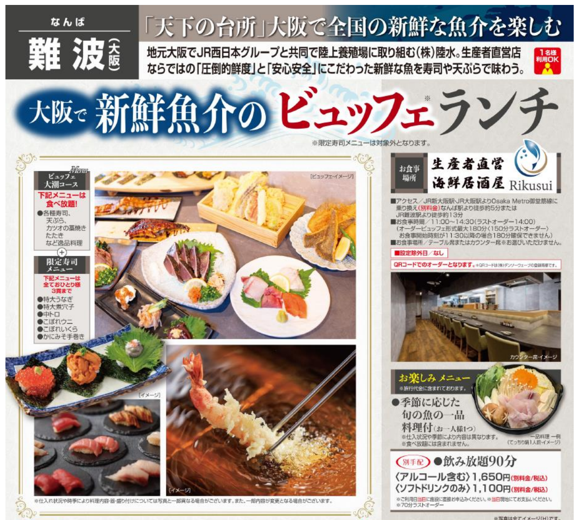 陸上養殖事業で当社と資本業務提携している(株)陸水と、JR西日本、(株)日本旅行、当社の4社が連携し、(株)陸水が運営する「生産者直営海鮮居酒屋Rikusui」が「秋の駅プラン」に登場します。駅プランならではの特別価格はもちろん、全国から選りすぐり圧倒的鮮度にこだわった鮮魚をビュッフェ形式で味わえるコースメニューに加え、旬の秋冬商材を使用したプラン限定の一品料理を提供予定です!