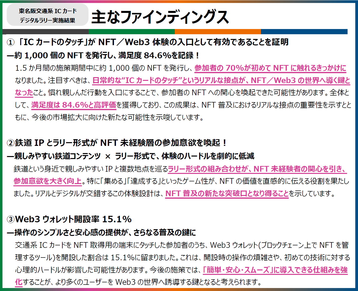 鉄道IPを活用したデジタルコンテンツとWeb3技術を組み合わせた新たな取り組みの第1弾として、2025年2月1日から3月15日までの期間、交通系ICカードを用いた鉄道車両の限定デジタルアイテム(NFT)をプレゼントするデジタルラリーキャンペーンを実施しましたが、今般、その実施結果がまとまりましたのでご報告します。