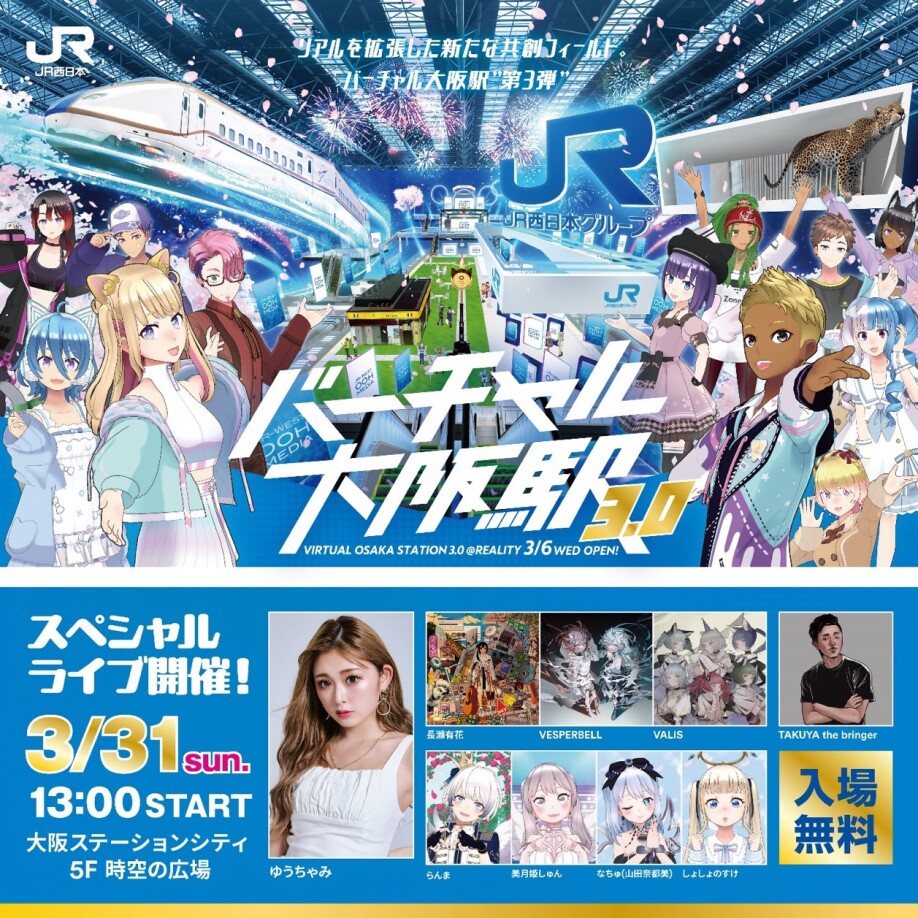 西日本旅客鉄道株式会社(本社:大阪市北区、代表取締役社長:長谷川 一明)、株式会社JR西日本コミュニケーションズ(本社:大阪市北区、代表取締役社長:伊藤 義彦)、株式会社JR西日本イノベーションズ(本社:大阪市北区、代表取締役社長:川本 亮)は、スマートフォン向けメタバース「REALITY(リアリティ)」において、「バーチャル大阪駅 3.0」を2024年3月6日(水)から期間限定で開業しています。リアルの「駅」をバーチャル上に拡張する「バーチャル大阪駅」の取り組みをより多くのお客様にご体感いただきたく、2024年3月31日(日)に大阪ステーションシティ5F 「時空の広場」において、スペシャルリアルイベント「バーチャル大阪駅 3.0 ライブフェス」を開催します。なお、この模様はバーチャル大阪駅 3.0特設ステージでもリアルタイムでお楽しみいただけます。