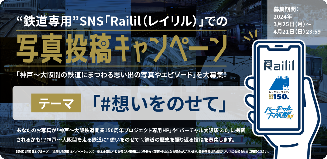 2024年5月11日に迎える神戸―大阪鉄道開業150周年の節目。鉄道の歴史的な節目を、関西の鉄道を支えてきたJR西日本グループとして、鉄道を愛するRaililユーザーの皆さんと一体となって盛り上げていきたい。その思いでRailil(レイリル)ではこの度、神戸~大阪鉄道開業150周年プロジェクトの1つとして、新たに投稿募集の企画を立ち上げました。