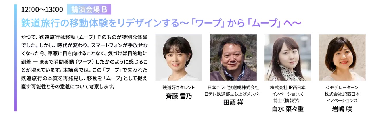 12月5~6日開催のJR西日本グループの総合展示会「イノベーション&チャレンジデイ2024」にて斉藤雪乃氏・田頭祥氏と弊社社員が鉄道旅行の魅力を語る講演会を行います!